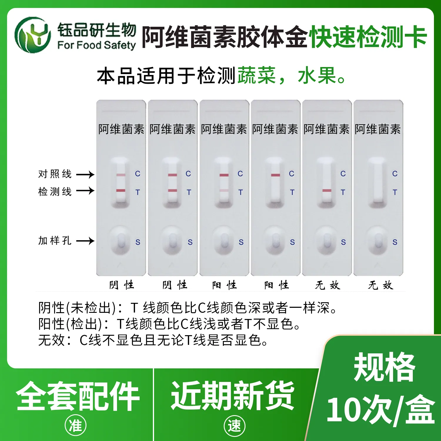 武汉钰品研生物噻虫胺胶体金快检卡,基于竞争抑制免疫层析技术。检测微孔内冻干金标抗体,硝酸纤维素膜检测线(T 线)包被噻虫胺抗原,对照线(C 线)包被羊抗鼠 IgG 二抗。样本中的噻虫胺与金标抗体结合,抑制其与 T 线抗原结合,借 T 线颜色变化,10 分钟内判断残留。操作简便,处理蔬菜、水果、粮食等样本后滴加试剂即可,无需专业设备。噻虫胺作为杀虫剂,若在食品中残留超标,长期摄入可能引发人体头痛、头昏、恶心呕吐等症状。我国对其在食品中的残留量严格管控。适用于种植、加工企业自检及监管抽检。咨询 13720286360,守护食品安全。...