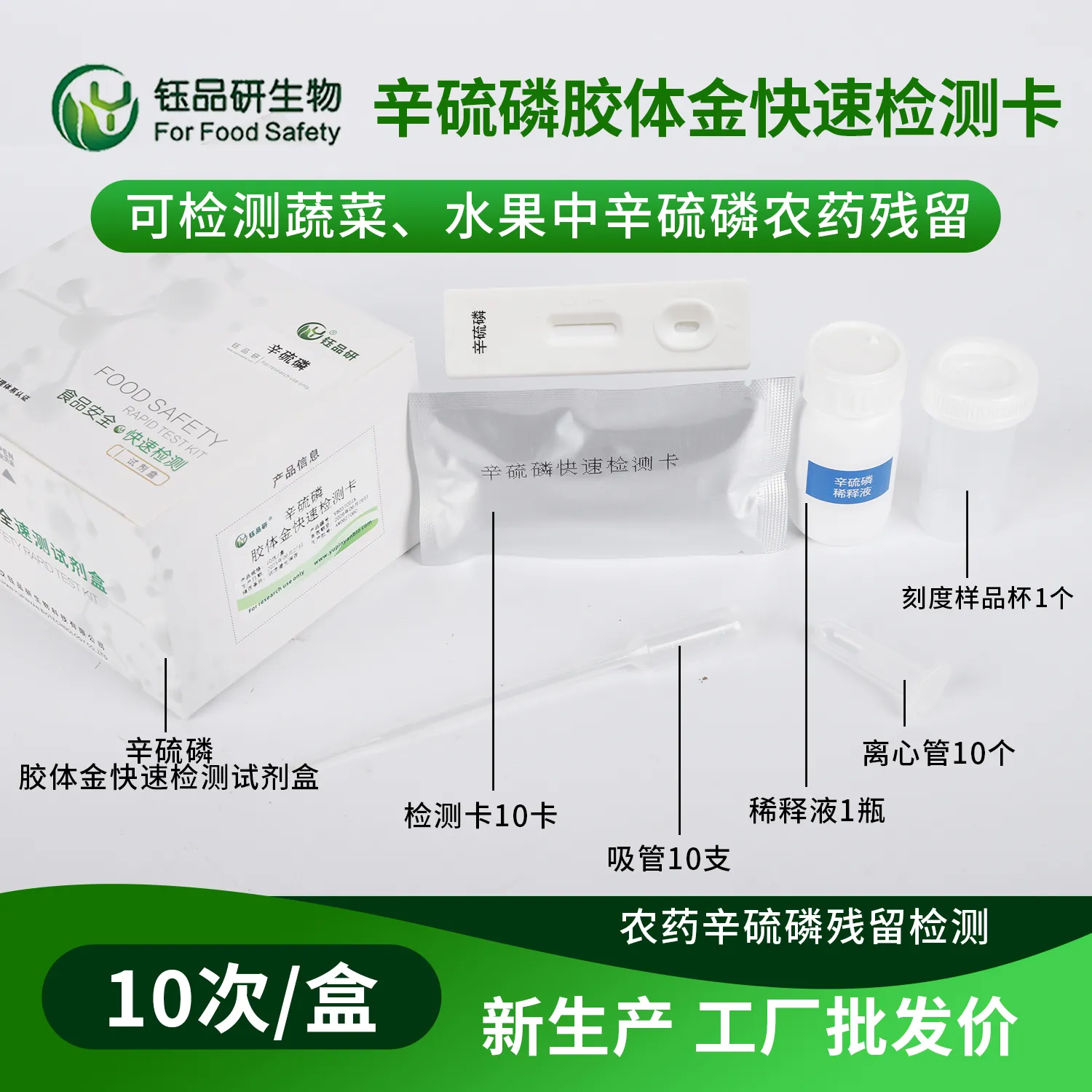 辛硫磷胶体金快检卡,基于竞争抑制免疫层析技术。检测微孔预冻干金标抗体,硝酸纤维素膜 T 线包被辛硫磷抗原,C 线包被羊抗鼠 IgG 二抗。样本中辛硫磷与金标抗体结合,抑制其与 T 线抗原结合,10 分钟内借 T 线颜色判断残留。操作简便,处理蔬果样本后滴加试剂即可,无需专业设备。辛硫磷属有机磷农药,残留超标会抑制胆碱酯酶,引发神经功能异常,危害健康。适用于种植、加工企业自检及监管抽检。咨询 13720286360,武汉钰品研生物。...