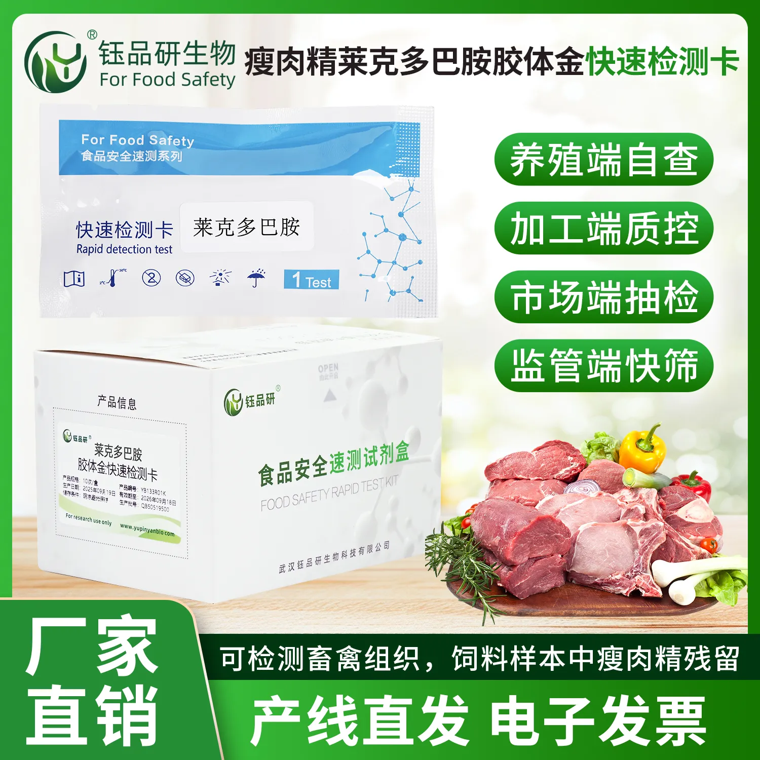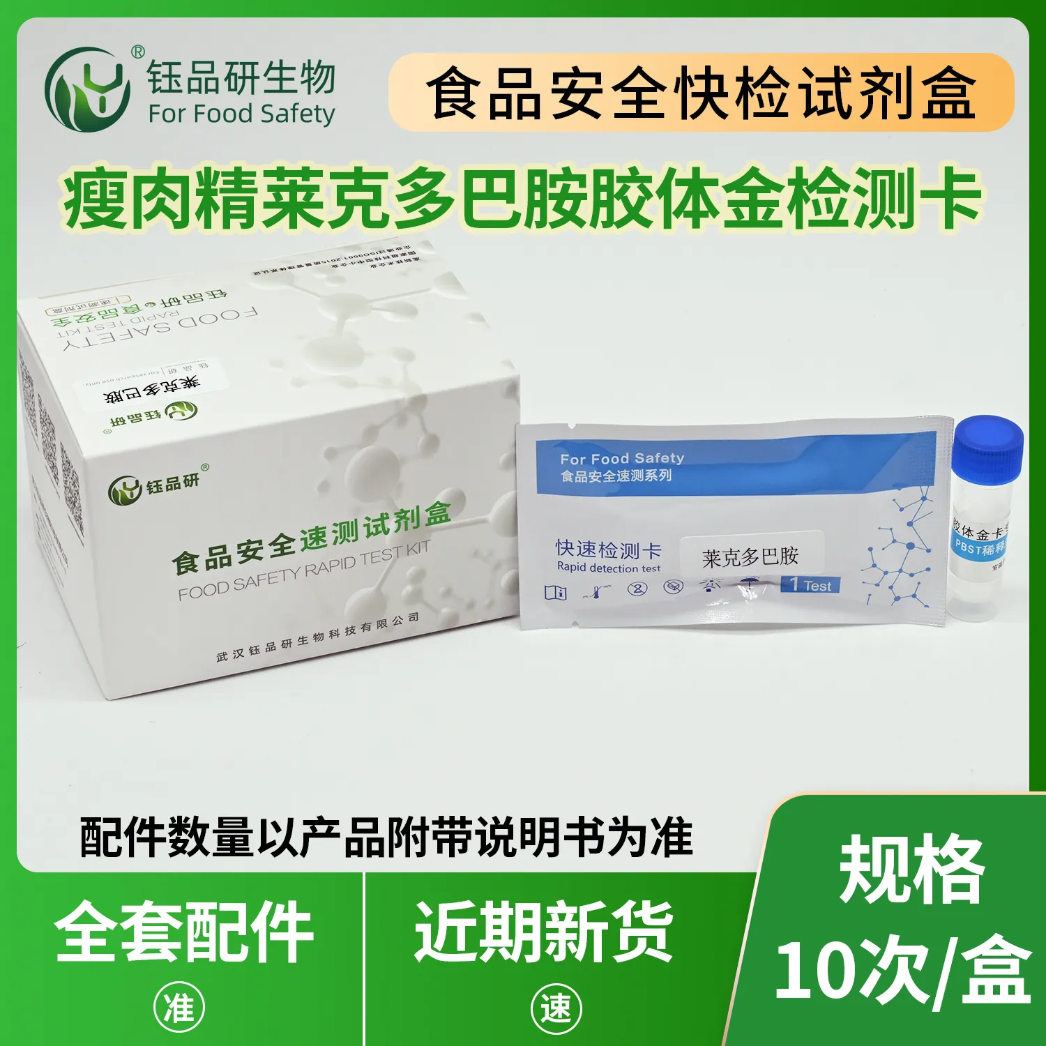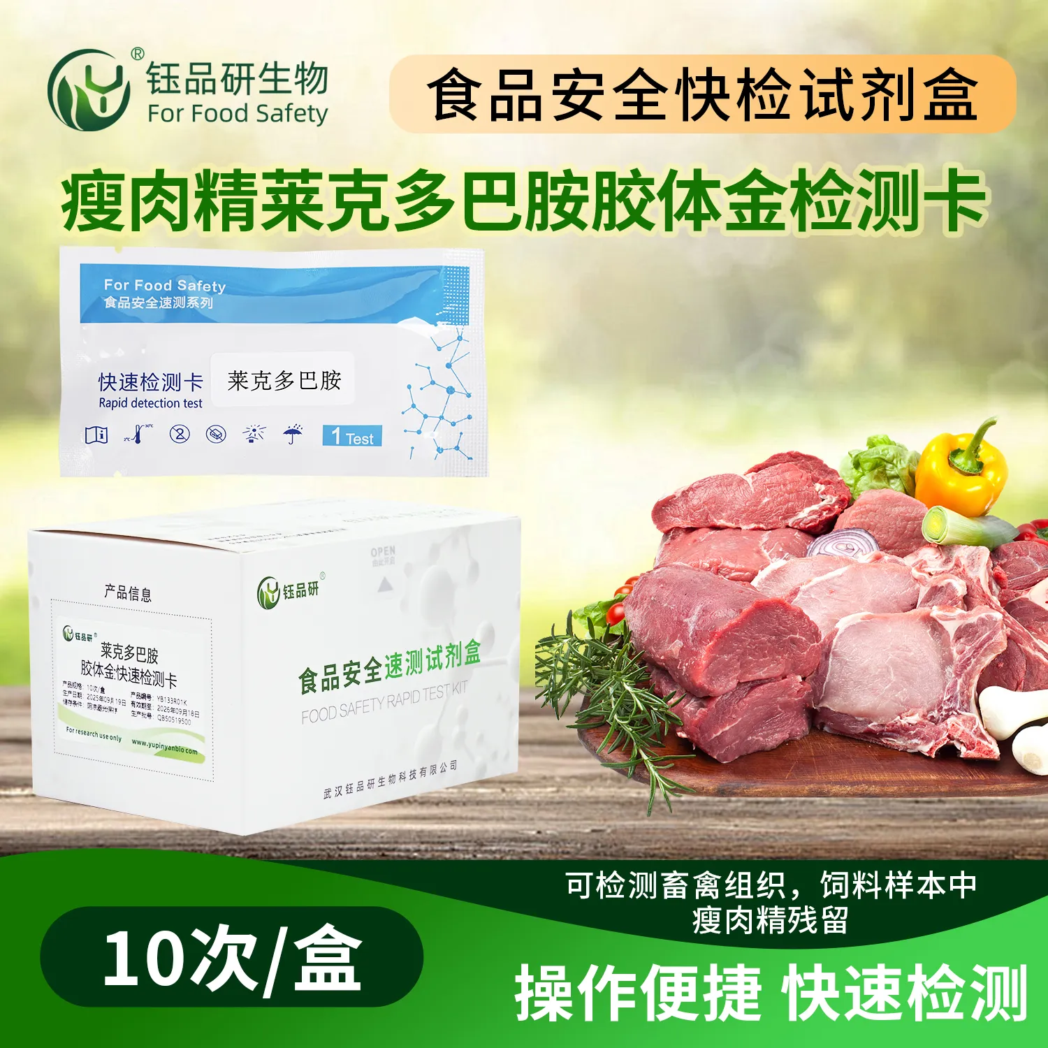 武汉钰品研生物莱克多巴胺胶体金快检卡,基于竞争抑制免疫层析技术。样本中的莱克多巴胺与胶体金标记的特异性单克隆抗体结合,抑制抗体与检测线(T 线)上的莱克多巴胺-BSA 偶联物结合,借 T 线颜色变化,10 分钟内快速判断残留情况。操作简便,无需专业设备,按说明简单处理猪和牛尿液、肉、酱肉等样本,滴加试剂即可。莱克多巴胺属 “瘦肉精”,我国严禁用于动物养殖,人食用含其残留的肉品,会出现肌肉震颤、心动过速、心律失常等中毒反应,严重危害健康。适用于畜禽养殖企业自检、市场监管抽检、农贸市场快检。咨询 13720286360,守护饮食安全。...