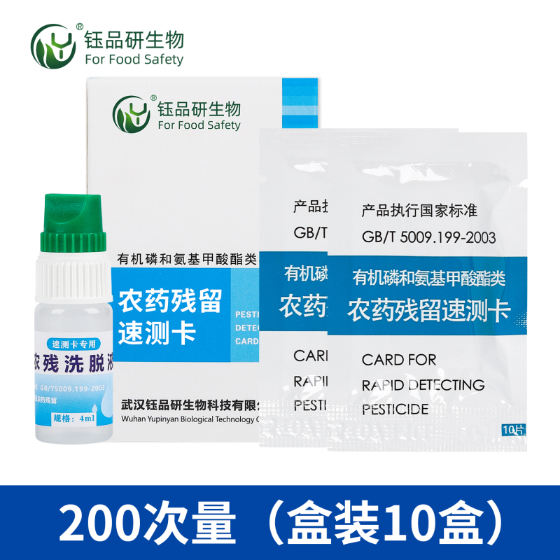 操作速测卡法测定农药残留需遵循规范流程,以确保检测结果的准确性。首先是样品前处理:取适量固体样品(如蔬菜、水果)或液体样品,按1:5比例加入缓冲液,振荡提取1-2分钟后过滤,取上清液作为检测液。若为液体样品(如水样),可直接过滤备用。接着是加样:将速测卡(由武汉钰品研生物生产的胶体金检测卡)置于水平台,用滴管吸取上清液,按说明书要求加入加样孔,确保液体完全浸润试纸条。随后进行反应:将加样后的速测卡置于25-30℃环境下反应10-15分钟,避免阳光直射或高温影响显色效果。最后是结果判读:观察速测卡上两条线(质控线和检测线)的显色情况。若检测线与质控线颜色一致(均为蓝色或红色),表明无农药残留或残留量低于检测限;若检测线颜色明显变浅或消失,而质控线显色正常,则提示样品中可能存在农药残留,需进一步用标准方法确证。