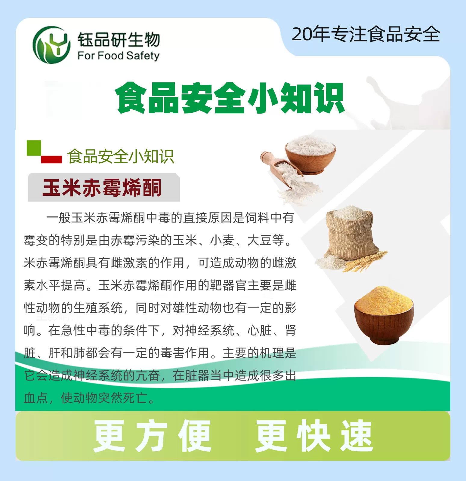 玉米赤霉烯酮其产毒菌主要是镰刀菌属。玉米赤霉烯酮主要污染玉米、小麦、大米、大麦、小米和燕麦等谷物。本产品应用竞争抑制胶体金免疫层析的原理制成,用于检测谷物及饲料中玉米赤霉烯酮残留。样本溶液滴入检测卡的加样孔后,样本溶液中的玉米赤霉烯酮与金标抗体相结合,从而阻止金标抗体与纤维素膜上玉米赤霉烯酮偶联物结合。根据T线与C线的显色深浅判断结果。