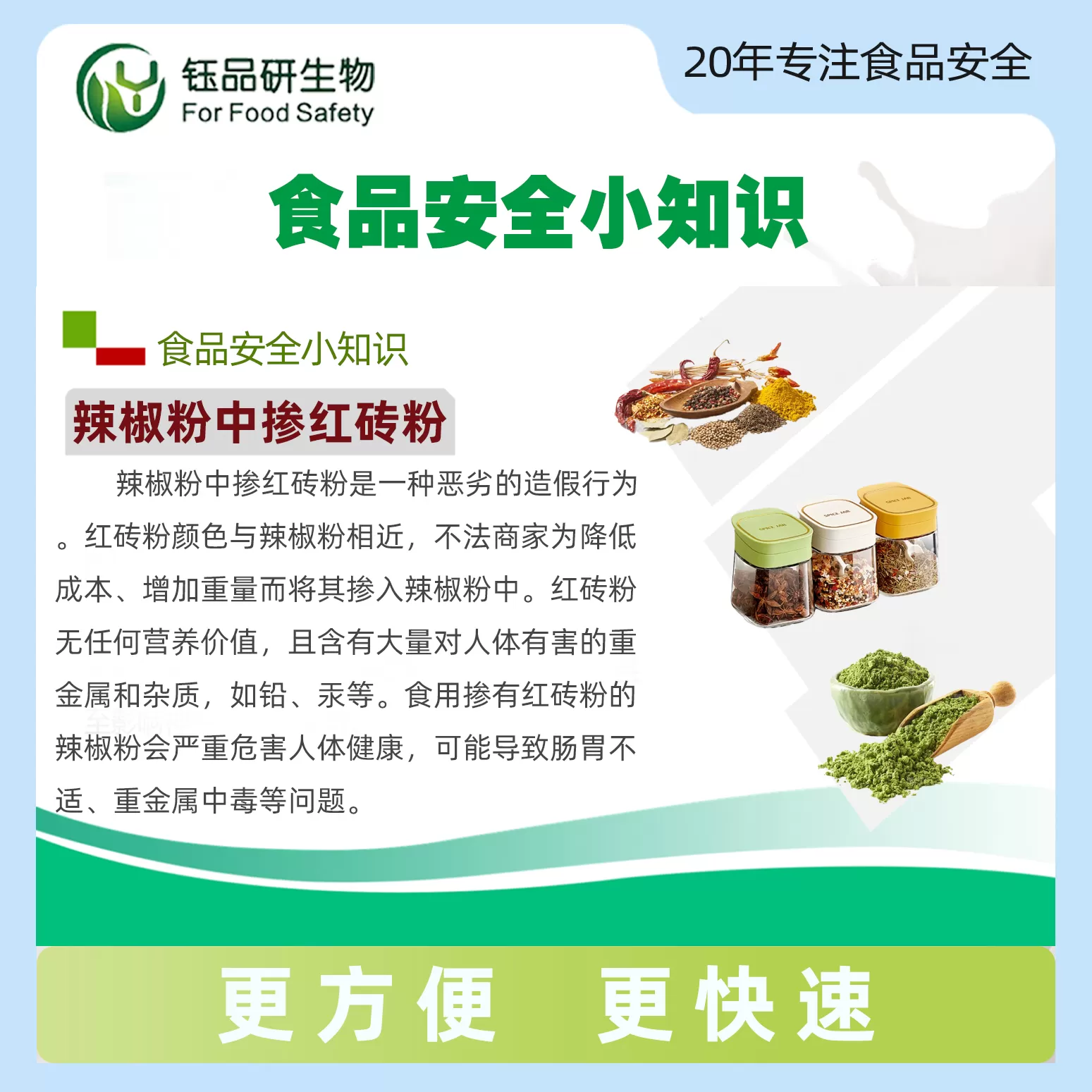 붉은 벽돌은 점토에서 발사되는 일반적인 건축 재료입니다. 붉은 벽돌은 고춧가루의 색깔에 가까운 Fe2O3를 함유하고 있기 때문에 빨간색입니다. 나쁜 상인들은 더 많은 이익을 얻기 위해 고춧가루의 무게를 늘리기 위해 고춧가루에 붉은 벽돌 가루를 첨가합니다. 붉은 벽돌 가루를 섞은 고춧가루를 먹으면 소비자의 건강을 해칩니다. 이 키트는 고춧가루와 붉은 벽돌 가루의 특정 중력에 따라 검출 시약을 추가하여 붉은 벽돌 가루가 고춧가루에 섞이는지 여부를 신속하게