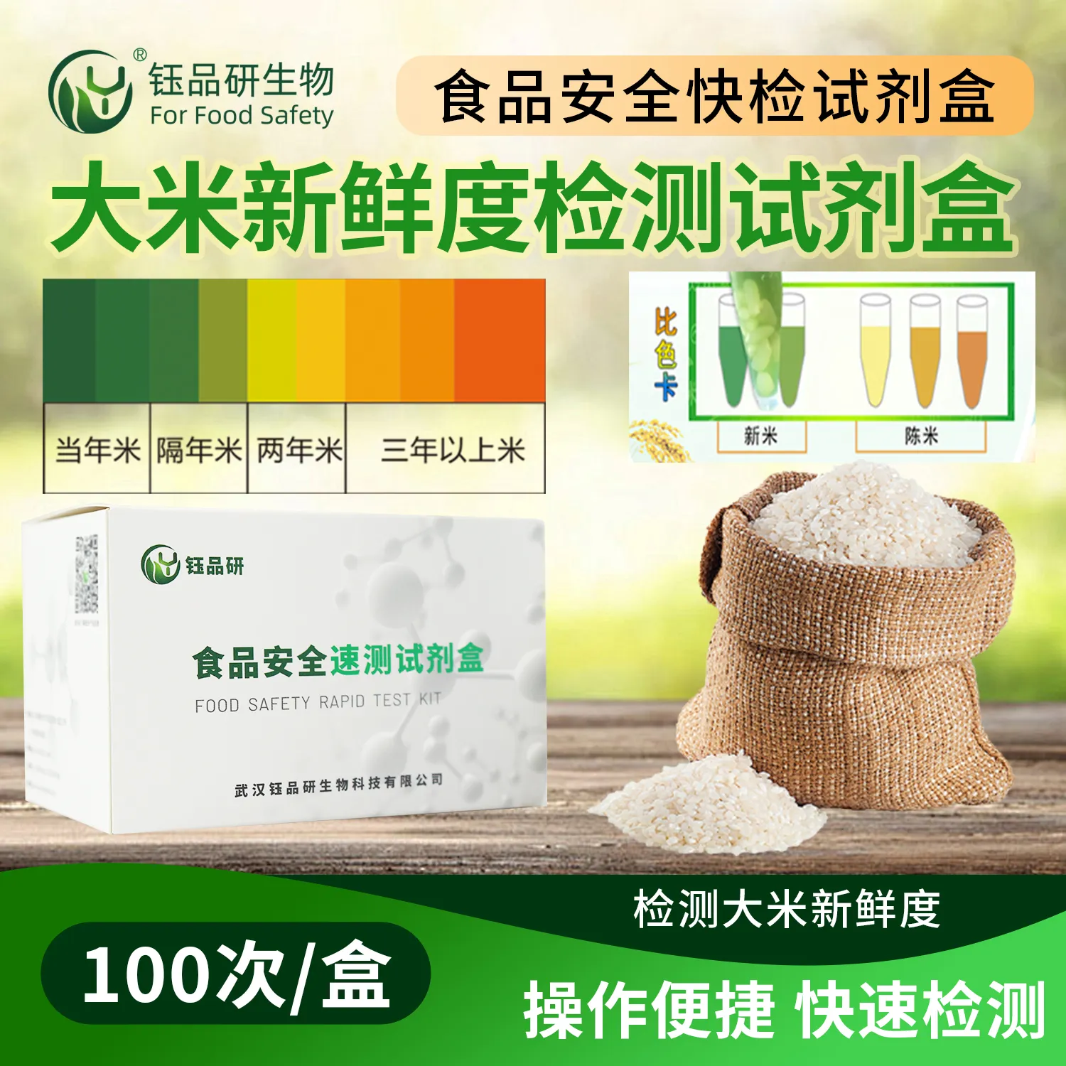 武汉钰品研生物推出大米新鲜度速测试剂盒,基于大米储存过程中脂肪酸被氧化或水解,分解出游离脂肪酸致使溶液 pH 值改变,酸度指示剂在不同 pH 下呈现不同颜色的原理,能快速精准检测大米新鲜度。操作简便,无需复杂专业设备,普通人员依照详细易懂的操作指南,短时间内即可完成检测,通过观察溶液颜色由绿到黄再到橙的变化直观判读结果。市场上大米品质参差不齐,部分陈米经抛光打蜡等手段以次充好,长期食用不新鲜大米可能影响健康。该试剂盒适用于大米生产加工企业质量把控、市场监管部门抽检、农贸市场快检、超市进货查验,以及家庭日常购买大米时自查新鲜度等场景。咨询热线 13720286360,武汉钰品研生物助力您精准辨别大米新鲜度,守护餐桌品质与健康。...