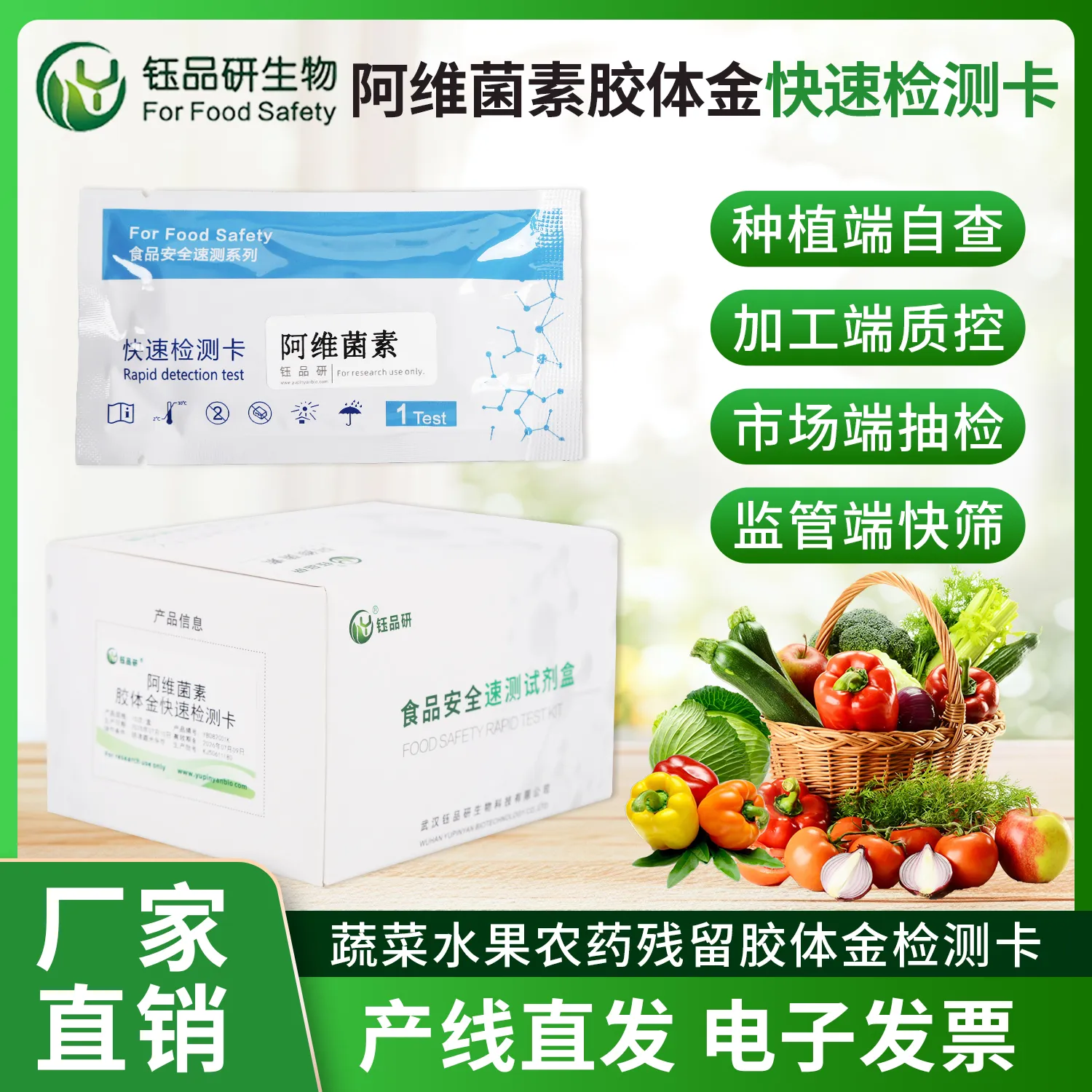 武汉钰品研生物噻虫胺胶体金快检卡,基于竞争抑制免疫层析技术。检测微孔内冻干金标抗体,硝酸纤维素膜检测线(T 线)包被噻虫胺抗原,对照线(C 线)包被羊抗鼠 IgG 二抗。样本中的噻虫胺与金标抗体结合,抑制其与 T 线抗原结合,借 T 线颜色变化,10 分钟内判断残留。操作简便,处理蔬菜、水果、粮食等样本后滴加试剂即可,无需专业设备。噻虫胺作为杀虫剂,若在食品中残留超标,长期摄入可能引发人体头痛、头昏、恶心呕吐等症状。我国对其在食品中的残留量严格管控。适用于种植、加工企业自检及监管抽检。咨询 13720286360,守护食品安全。...