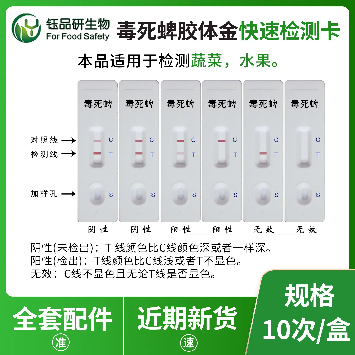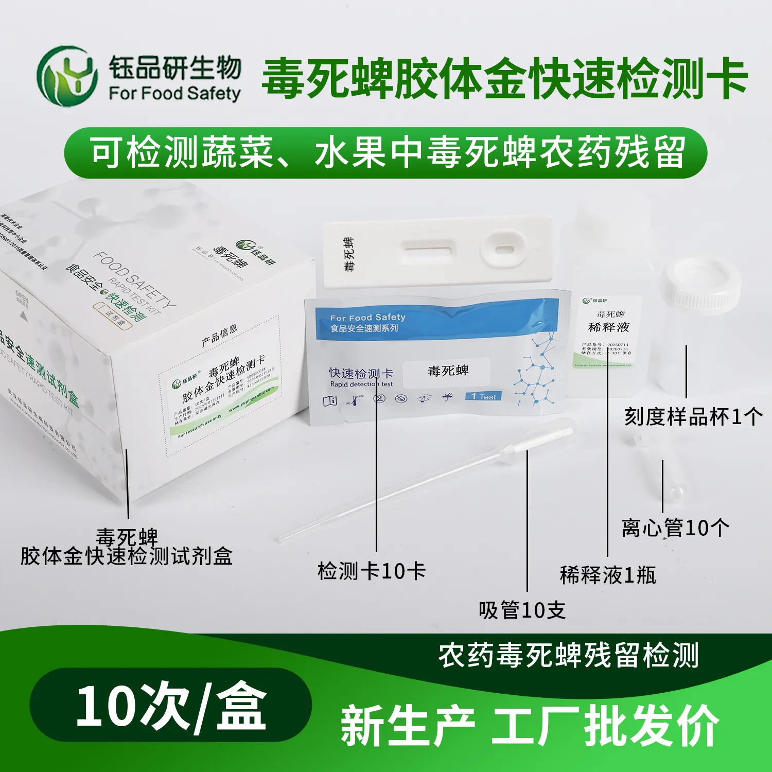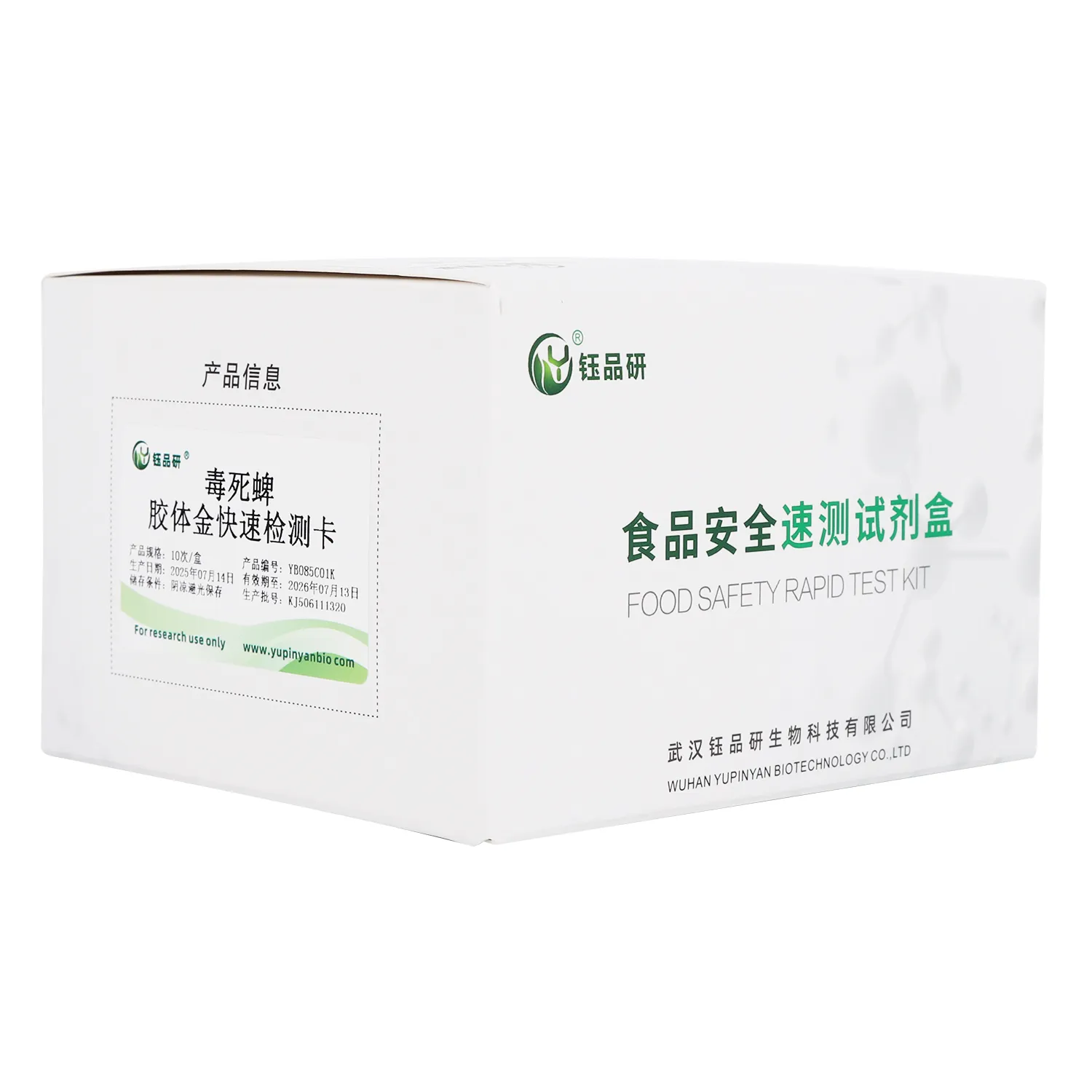 武汉钰品研生物毒死蜱胶体金快检卡,基于竞争抑制免疫层析技术。检测微孔内冻干金标抗体,硝酸纤维素膜检测线(T 线)包被毒死蜱抗原,对照线(C 线)包被羊抗鼠 IgG 二抗。样本中的毒死蜱与金标抗体结合,抑制其与 T 线抗原结合,借 T 线颜色 10 分钟内判断残留。操作简便,处理蔬菜、水果、粮食等样本后滴加试剂即可,无需专业设备。毒死蜱作为有机磷杀虫剂,若在食品中残留超标,会抑制胆碱酯酶活性,影响神经系统功能,长期摄入可致头痛、头晕、恶心呕吐、肌肉震颤等症状,危害健康。我国对其在食品中的残留量严格管控。适用于种植、加工企业自检及监管抽检。咨询 13720286360,守护食品安全。...