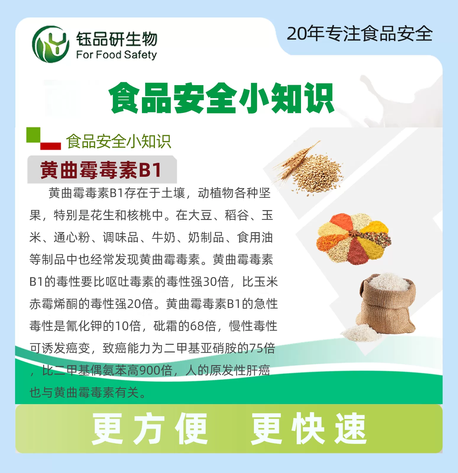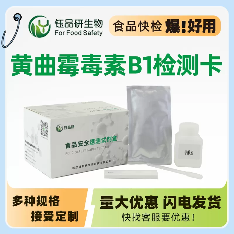 Афлатоксин В1 (AFB) є одним з найбільш канцерогенних хімічних речовин, відомих в даний час. AQSIQ передбачає, що Афлатоксин В1 є одним з обов 'язкових елементів перевірки для більшості продуктів харчування. Цей продукт використовується для швидкого виявлення залишків афлатоксину В1 в зернах і кормах. Весь процес виявлення займає всього близько 20 хвилин. Він підходить для всіх видів підприємств і випробувальних установ.