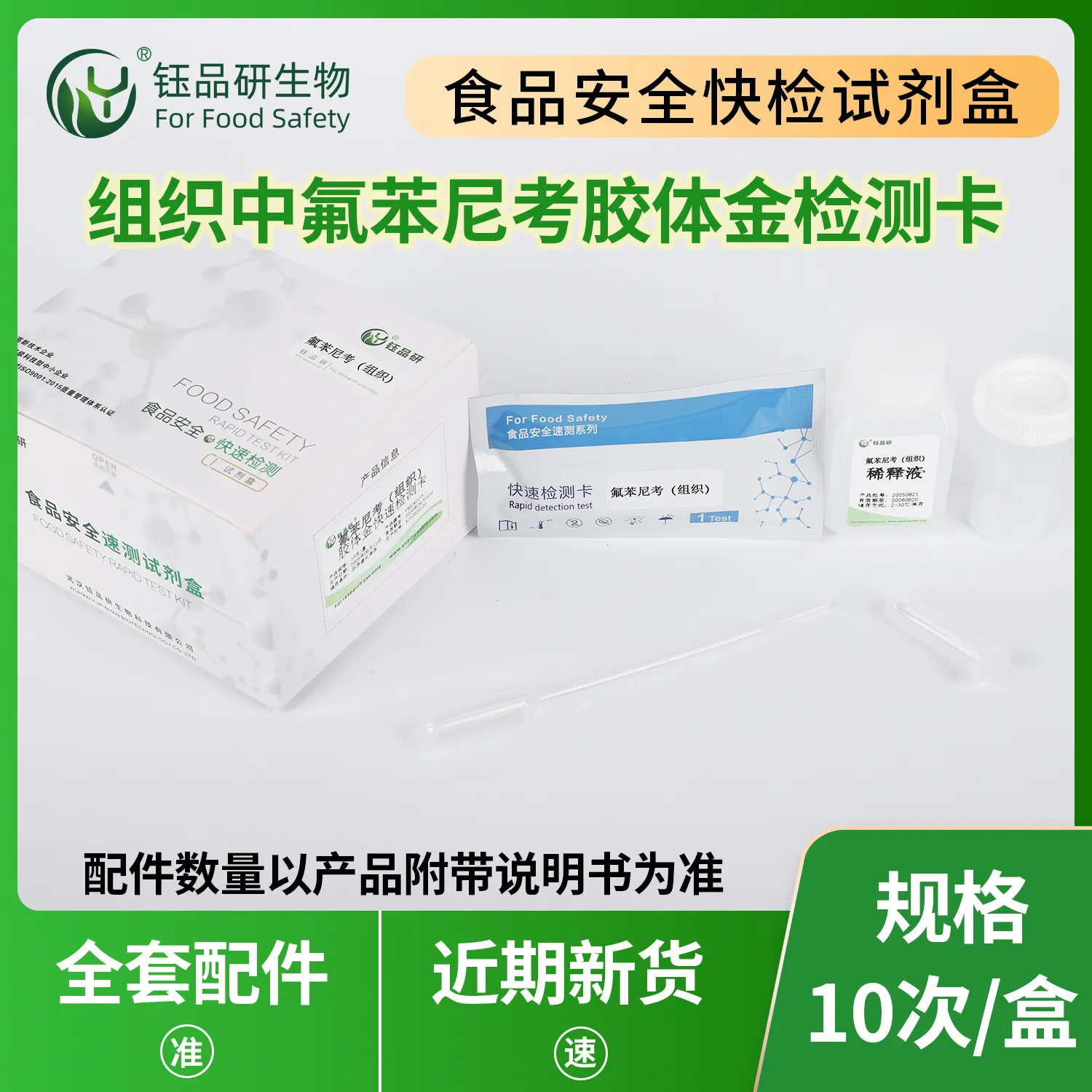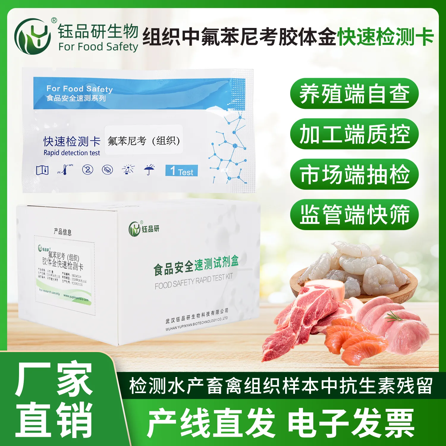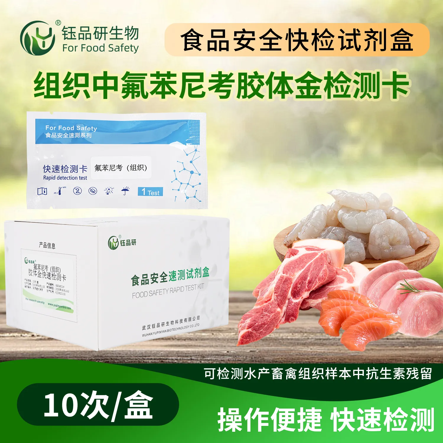 氟苯尼考胶体金快检卡,运用竞争抑制免疫层析技术。检测微孔预冻干金标抗体,硝酸纤维素膜 T 线包被氟苯尼考抗原,C 线包被羊抗鼠 IgG 二抗。样本中的氟苯尼考与金标抗体结合,抑制其与 T 线抗原结合,10 分钟内借 T 线颜色判断残留。操作简便,处理畜禽肉、蛋类、水产品等样本后滴加试剂即可,无需专业设备。氟苯尼考作为动物专用抗菌药,若使用不当致残留超标,会损害人体骨髓造血机能。适用于养殖、加工企业自检及监管抽检。咨询 13720286360,武汉钰品研生物。...